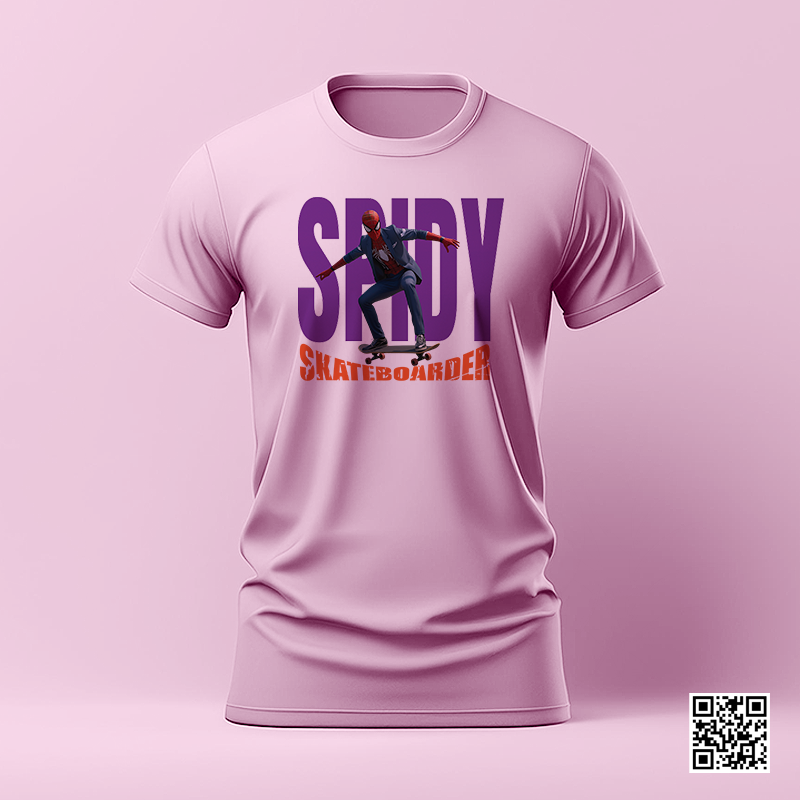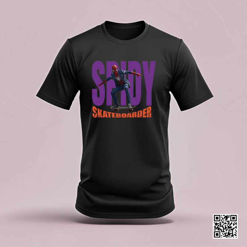 Featuring a bold and dynamic design of Spidy in a sharp suit riding a skateboard, this tee perfectly blends superhero vibes with urban cool. The powerful purple “SPIDY” backdrop and striking orange “SKATEBOARDER” text make this artwork pop on any shirt color.